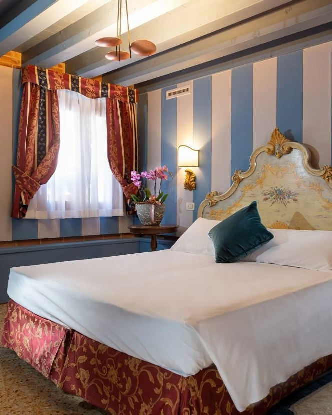 Its interiors blend history and comfort with exceptional delicacy. Furniture inspired by local masters, Venetian floors, exposed beams, Murano glass lamps, and fabrics in Tiziano-inspired gold and red tones create an atmosphere reminiscent of a small artistic palazzo. Every space invites guests to step into a story, where historic charm meets serene comfort, leaving a lasting impression that always calls you back.